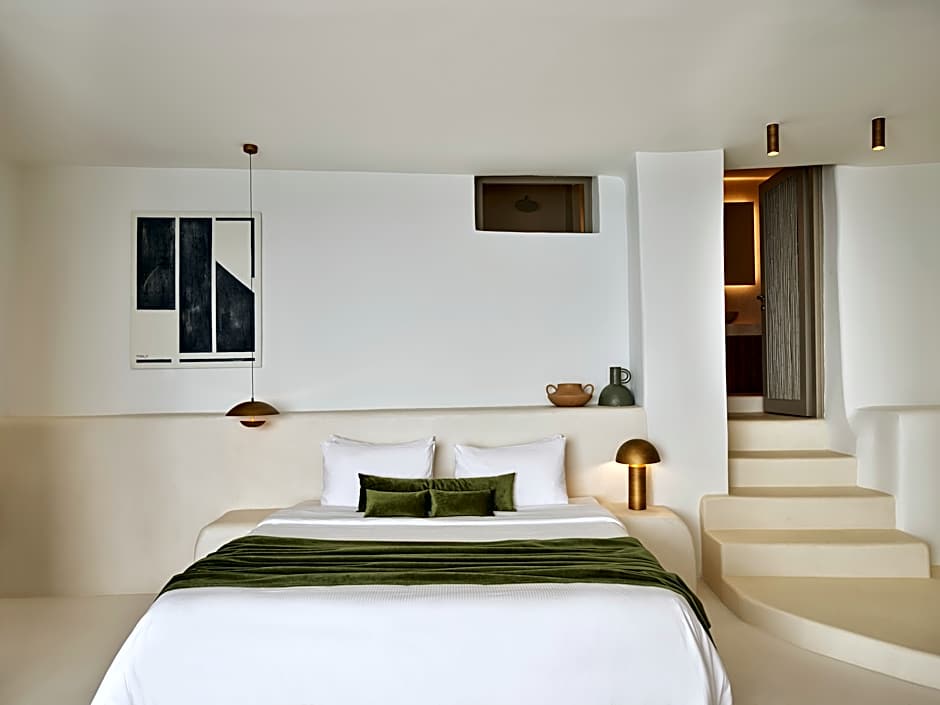 This one-bedroom, at 75m2, provides luxury, comfort and intimacy. The roomy accommodations consists of of a bedroom with walk-in closet and ample bathroom that opens onto the living area. The suite’s private terrace with an infinity heated pool frames an beautiful view of the caldera.
