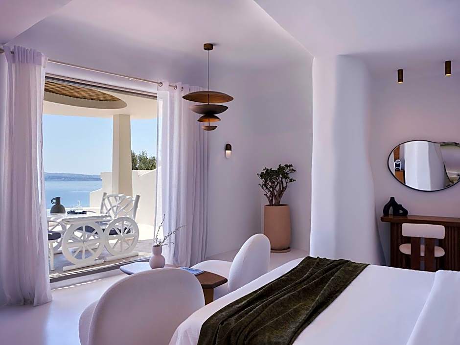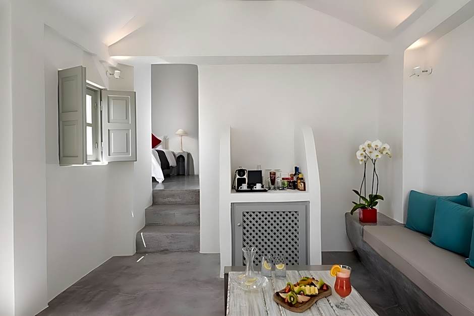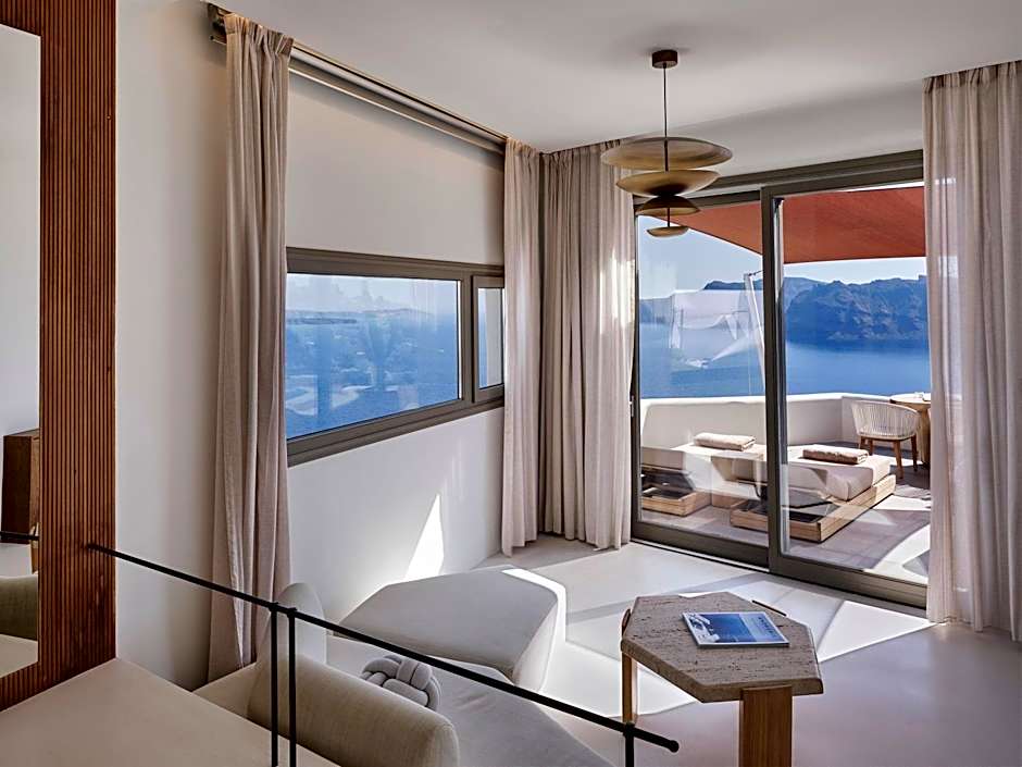 The open-plan Grande Suite of 148 ft² offers a king size bed and an elegant living room with indoor hot tub, a spacious bathroom with shower, spacious private veranda with incredible views of the Caldera. Please note that this room type cannot accommodate an extra bed.