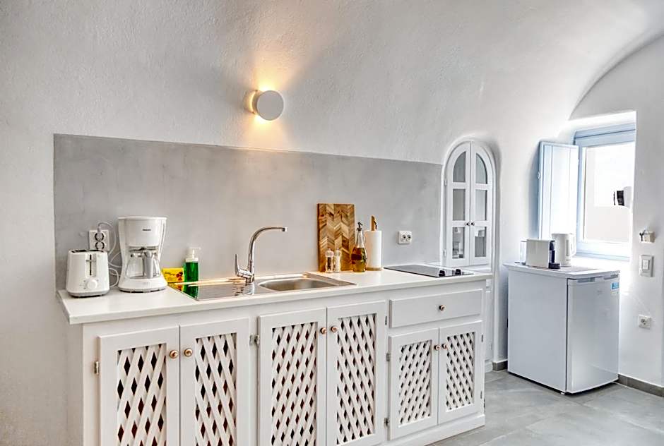Opening to a large terrace with full views to the volcano, Caldera and the Aegean Sea, this studio consists of a bedroom with seating, kitchenette and private bathroom. A hot tub is also available. Please note that this studio cannot accommodate an extra bed.
