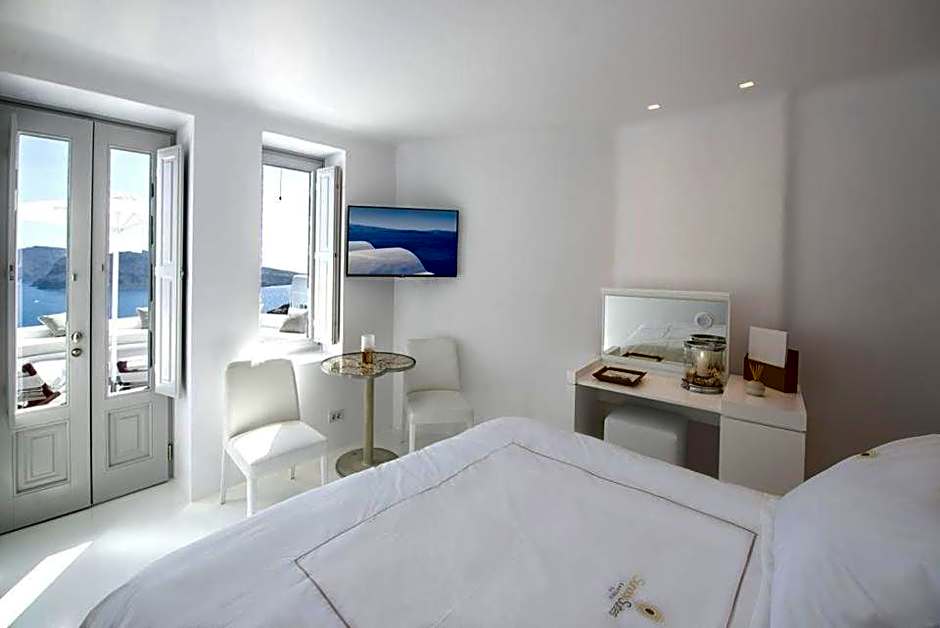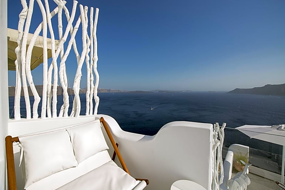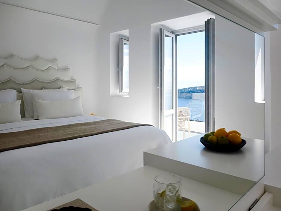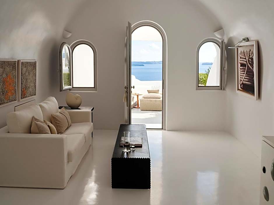 This entry-level suite features one spacious bedroom with a king-size bed and an open-plan sitting and dining area for your indoor relaxation. All the furnishings are custom-made and of high artistic quality. The bathroom comes with a rain shower, while the veranda offers a panoramic view of the volcano, caldera, and the Aegean Sea.