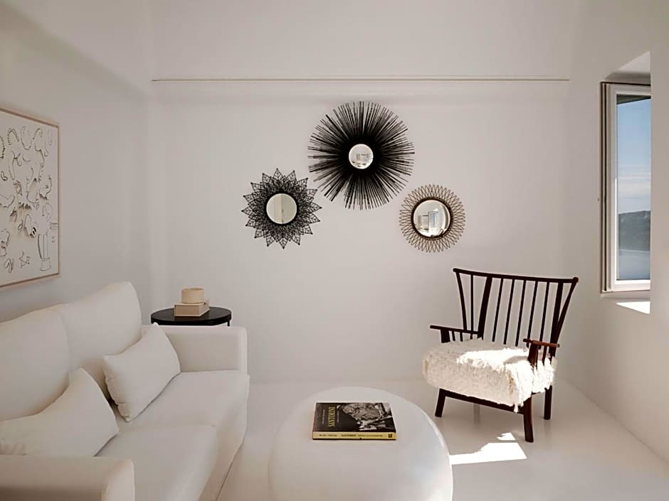 The Master Suite offers a spacious bedroom with a king-size bed, a generous living room, and a bathroom equipped with a refreshing rain shower. This suite is tastefully decorated with a unique artistic style and inspired furnishings. Take a dip in your private infinity pool or bask in the sun on the loungers while relishing the magnificent views of the Volcano, the Caldera, and the Aegean Sea.