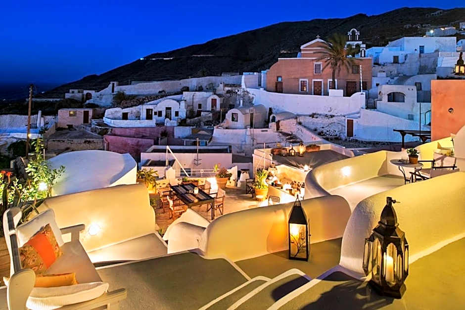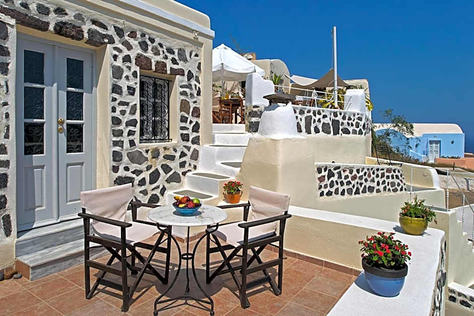 An open-plan suite with a cave bedroom, an antique dining room and a cement bathroom. This suite has access to a small path that leads to Oia.