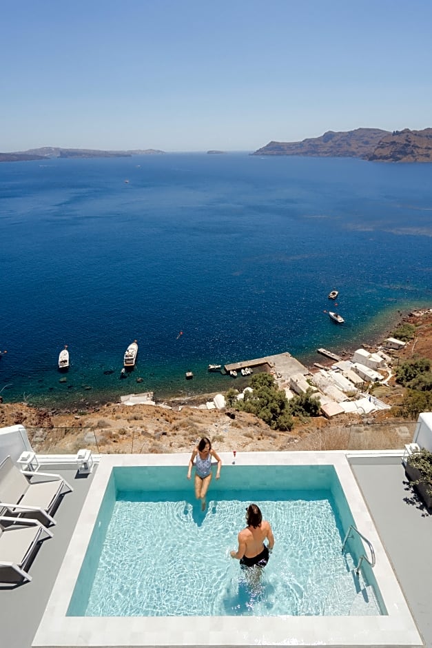 This deluxe suite opens to a terrace with a private pool and views over the Caldera, the Volcano and the Aegean Sea.