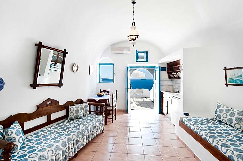 Apartments are more spacious and also feature a sitting area with sofa bed. They open to a private terrace enjoying views of the volcano, the Aegean Sea and the sunset.