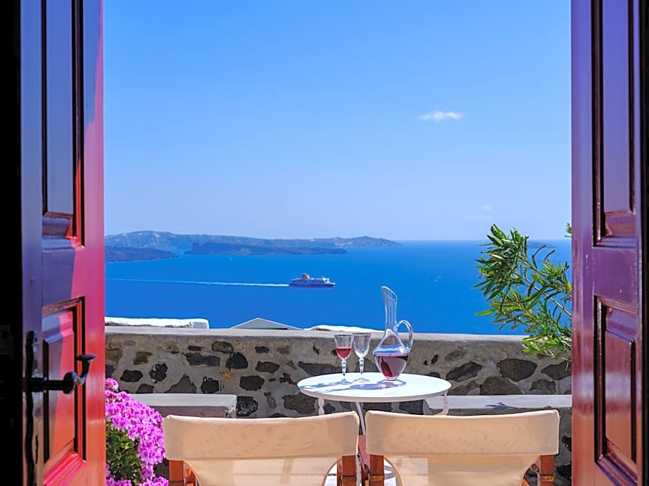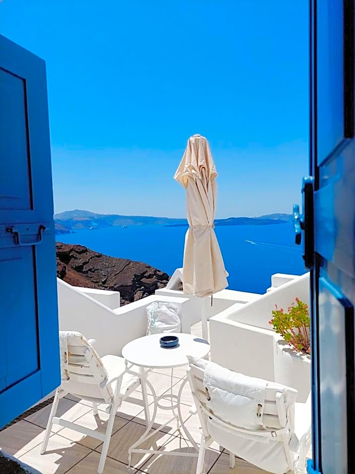 This air-conditioned studio opens to a private balcony or patio with Aegean Sea, volcano and sunset views. A kitchenette with fridge is included.
