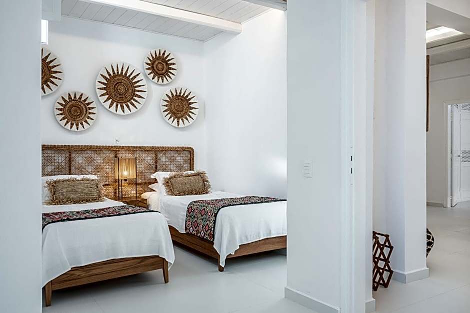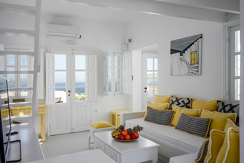 This split 3-level villa with one of the bedroom located on loft level accessible with wooden staircase features an outdoor, private pool and a private hot tub for 6. Offers sun terrace overlooking the Aegean Sea and the sunset. All remaining bedrooms are located on the lower level. There are also a shared outdoor fireplace and a private outdoor dining area covered by a pergola. The villa includes a private garden and provides access to two shared pools. It includes a fully equipped kitchen with coffee maker, living room with a flat-screen TV, and eco-friendly mattresses. Free WiFi is available. Upon arrival, guests are offered a welcome basket including a bottle of wine, orange juice, water and traditional Greek products. Extra beds and baby cots are provided on request.