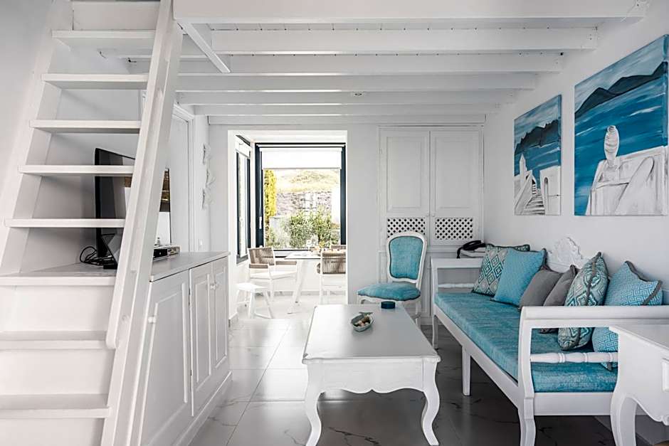 This split level villa with one of the bedroom located on loft level accessible with wooden staircase features an outdoor, private pool and a private hot tub for 5 with a 150-m² sun terrace overlooking the Aegean Sea and the sunset. There is also an outdoor dining area covered by a pergola. The villa has access to 2 shared pools, an outdoor fireplace and has a private garden. Inside, the villa includes a fully equipped kitchen, living room with flat-screen TV and DVD player, eco-friendly mattresses and a washing machine. Free WiFi is available. Extra beds and baby cots are provided on request.