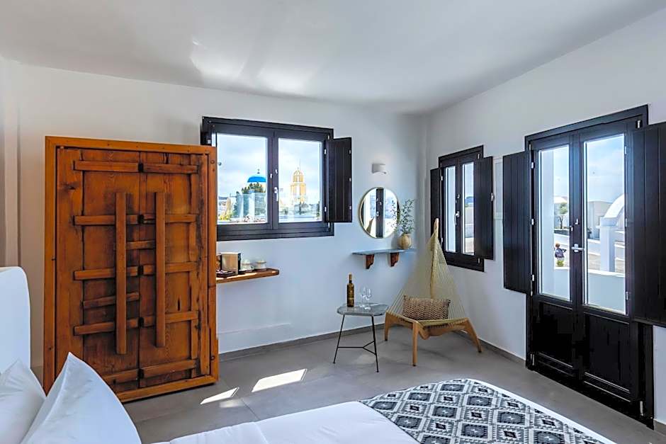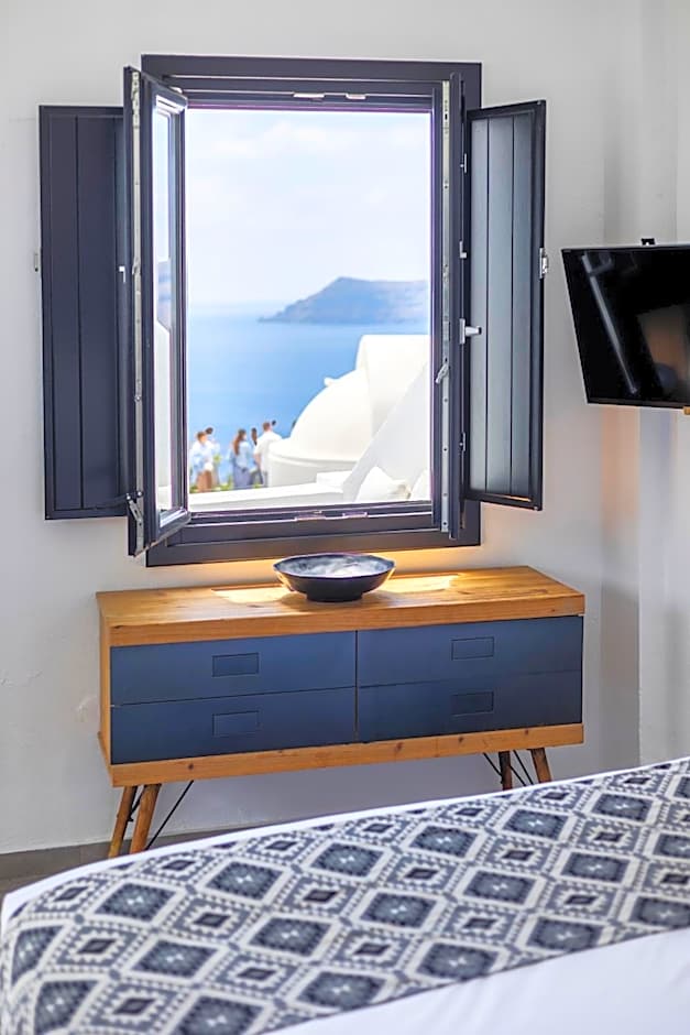 Blue Horizon Villa with Plunge Pool and Caldera View. Overlooking the Volcano and the Aegean Sea from its upper floor balcony, this air-conditioned, domed villa is fitted with a built-in king-size bed, anatomic mattresses, and high-quality bed linens. It features: -a heated and jetted plunge pool on its balcony with stunning views of the Aegean Sea and the Caldera,- a bedroom area with windows facing the Caldera offering spectacular views from the interior of the house as well, Smart TV, and free Wi-Fi access. The villas' amenities include luxury toiletries, slippers, and a hairdryer. The balcony is complete with outdoor furniture and a comfy sun daybed. The villa is located in a privileged location at the start of the pedestrian road of Oia's center, in the main market and restaurants and the city's buzz and fuzz, above Luno all-day bar. It is ideal for guests who wish to enjoy the vibes, the music, and the fun of the city center.