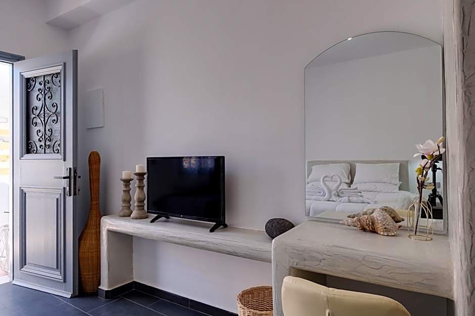 Room options range from Quadruple Room with Panoramic View to Duplex and Superior Studio, with additional choices such as Deluxe Studio, King (featuring a king-size bed), Studio, Partial Sea View, Quadruple Room, Sea View, Studio, Sea View, Twin Room (with a twin bed), and Double Room. Cash is not accepted, with Visa, Diners Club, American Express, Mastercard, Maestro, and UnionPay accepted. The stay sits about 1,1mi from Kamari’s city center, anchored on Agia Paraskevi Beach for easy access to the island’s sights.
