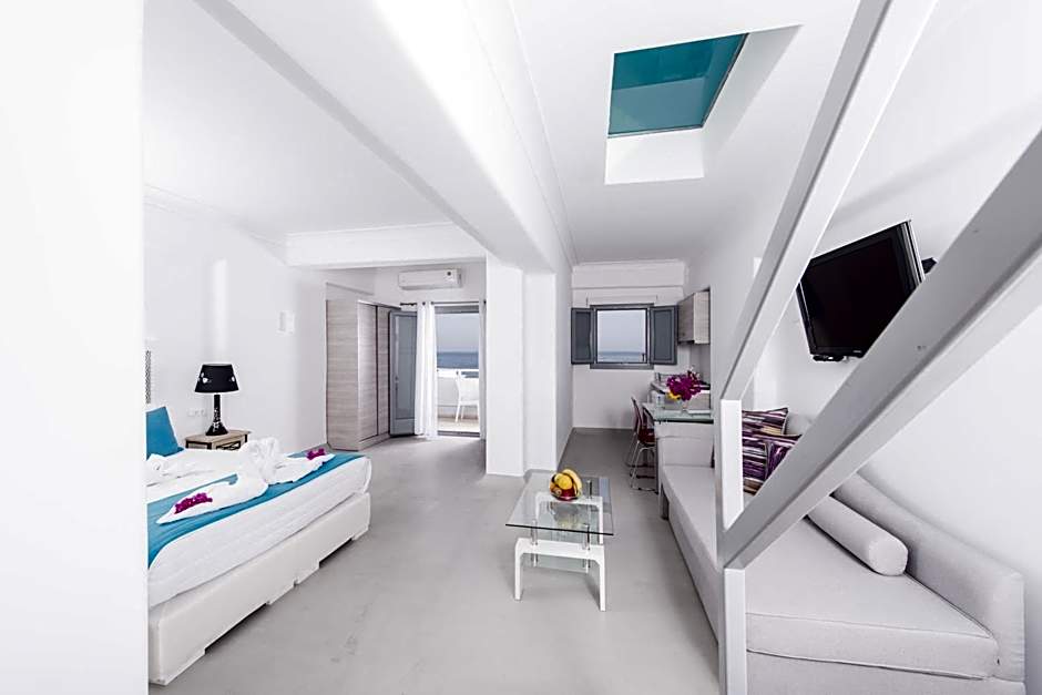 Just 98 feet from Kamari Beach, this air-conditioned and traditionally decorated suite is fitted with a private hot tub. Opening to a private veranda and a rooftop terrace with a private spa bath. It also features a kitchenette with dining area and fridge.The private bathroom is stocked with a hairdryer.