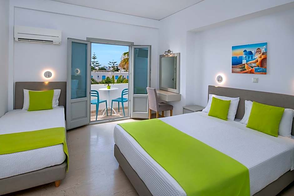 Rooms very nice, modern furniture, very, very clean!! They cleaned the rooms daily, changed the towels and sheets. Great pool and bar, sunbeds available for everyone. Very good location, 5-10 min walk to the beach, tavernas and shops.