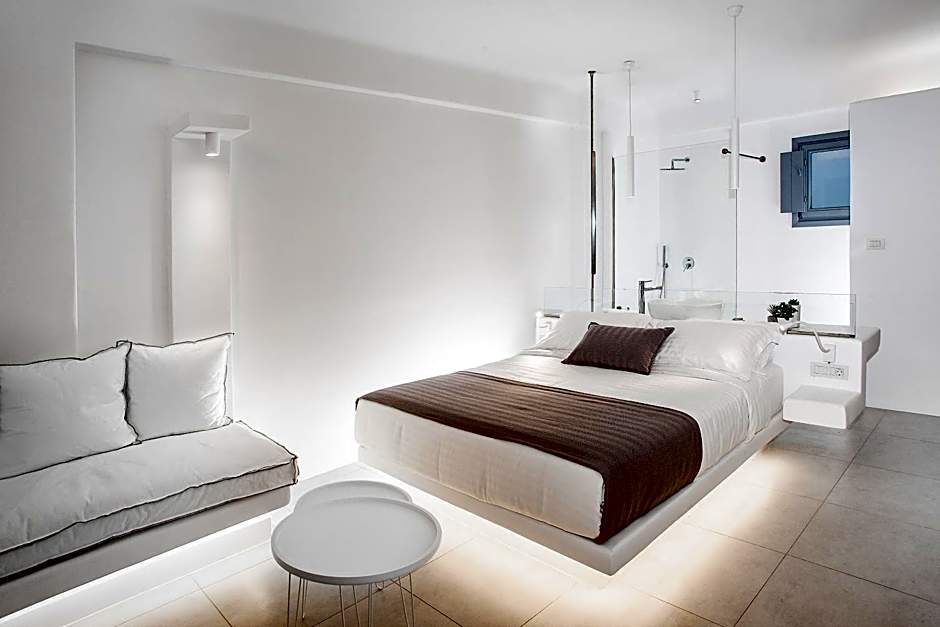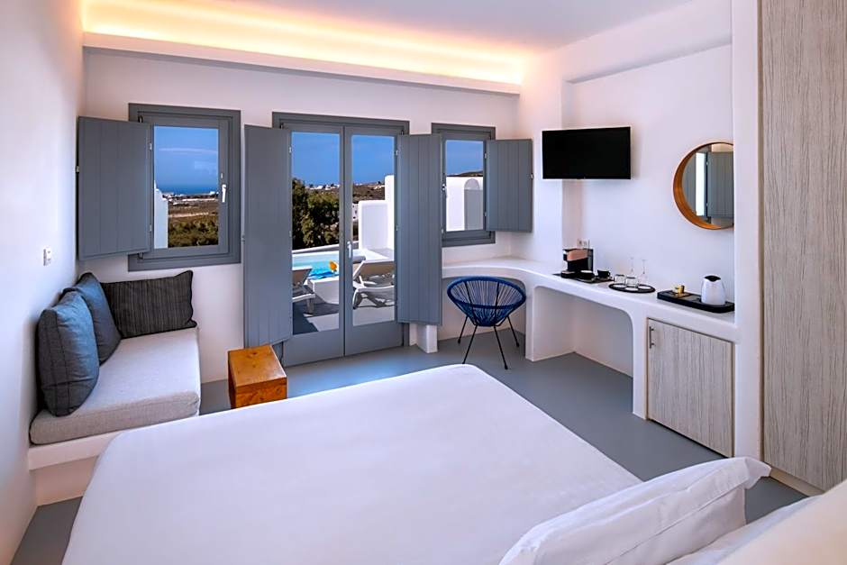 This Cycladic-style senior suite includes an open plan bedroom with a king size bed, a sitting area, bathroom with shower, a private veranda with a outdoor plunge pool and sea view.