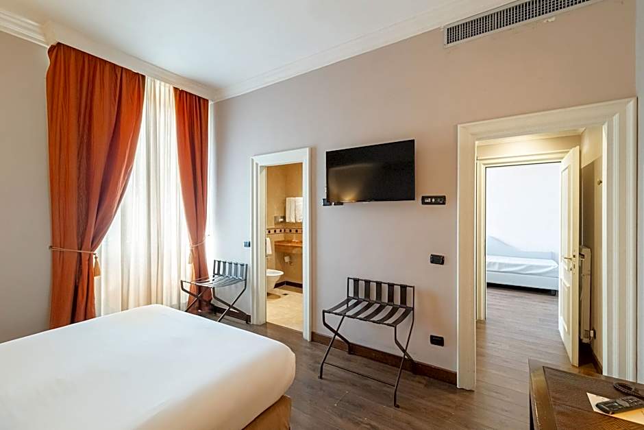 Warmly decorated junior suite with a double-bedded bedroom, a living room, bathroom with bathtub and shared terrace. It is located in the main building.