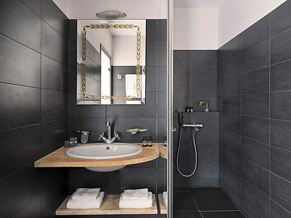 Opening to a spacious private veranda with breathtaking views over Grikos bay, this suite includes a bedroom and separate living room. The elegantly decorated suite offers 2 bathrooms with a shower.