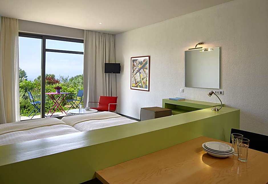 Room was exceptionally big and provided, besides a comfortable bed, a small sitting area, nice terrace, a kitchenette we could prepare coffee early in the morning. Room was tidy, cleaned each day, and a problem detected in the toilette , was taken care of in a matter of minutes. Breakfast was more than satisfactory, nice assortment of ingredients, served in a lovely area inside and outside the dining room Beach was nearby, reachable by foot or by car- sloppy road leading to the beach which is , like most beaches, rocky. The hotel runs a nice shop with modest prices similar to those in regular stores One of the hotel 's greatest assets is its staff- friendly, knowledgeable, very attentive and willing to assist- should be recommended: Angelina, Maria, Nikos and Takos but all the other employees as well. Place had in total an atmosphere of tranquility which affected the way we breathed