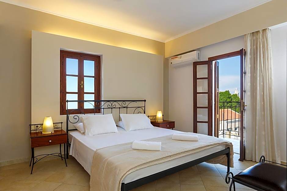Traditionally decorated, this suite opens to a balcony or patio with views to the garden and Symi Mountain. It includes a separate air-conditioned bedroom and a living room and offers: