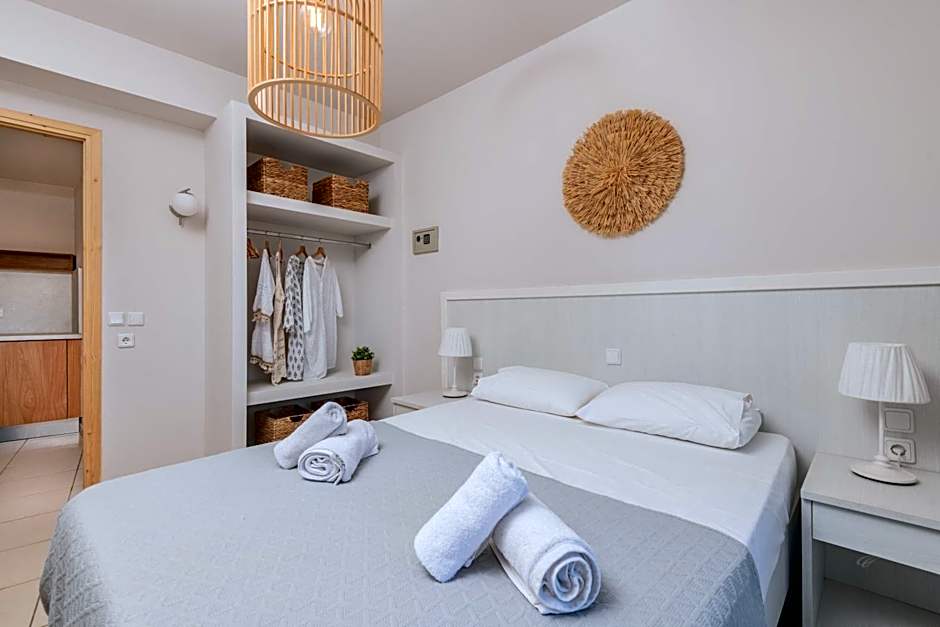 We love these apartments! It was our 3rd or 4th year staying here (2 adults and 2 kids). One side is view of the salt marsh the other side views of the gardens/ trees, both lovely. Apartment includes a kitchen with small fridge/ freezer, nice bathroom, air conditioning, TVs with Netflix. Lovely bespoke breakfast options served in the restaurant outside at your table. 5 minutes from a beautiful sandy beach with warm shallow water. Close to restaurants such as Piccadilly and Dolphin who are happy for you to stop by to use their swimming pools if you buy a coffee or drink. Excellent restaurants close by including the apartments own restaurant which is the best food. Stavros the owner is very friendly and helpful, we will always return as is the lovely cleaner.