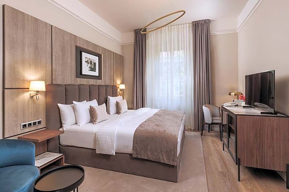 This type of rooms have a bigger one air space of 33-47 m2. All Deluxe room have a couch, air conditioning, which can be regulated individually, they are equipped with LCD UHD TV, in-room safe, mini-bar, tea and coffee-maker and free wireless internet access. The bathroom is equipped with a shower or with a bathtub, toiletries, hairdryer and bathrobe. The bed in the rooms have a 200*200 king size mattress, and the couch (160*79 in) can be made also for 2 people.