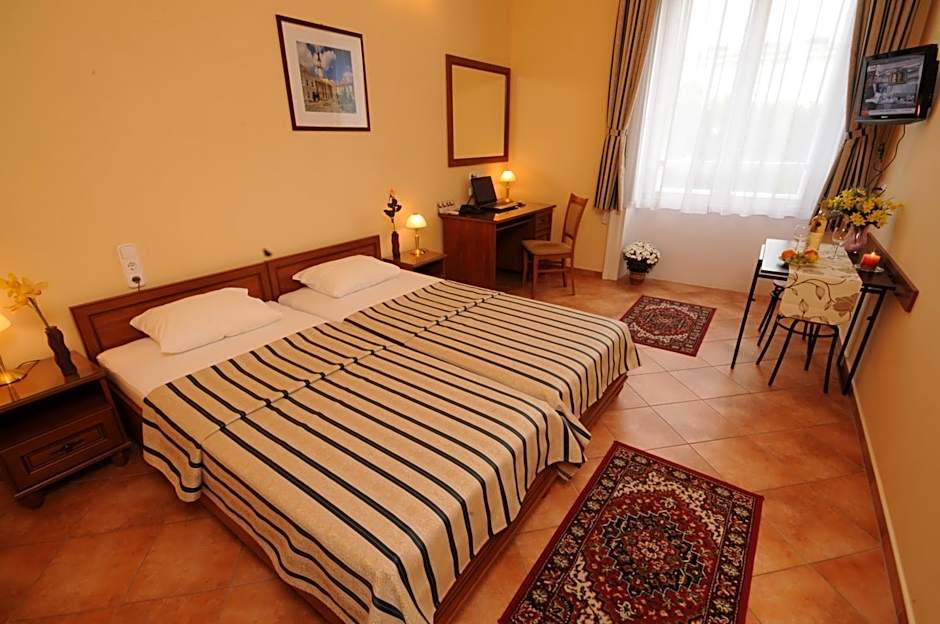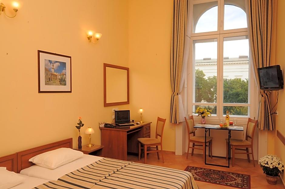 The Budapest Museum Central offers Standard Double or Twin Rooms for single occupancy. These rooms accommodate 2 adults with no children, feature either 2 twin beds or 1 queen size bed, and do not allow smoking. The room size is approximately 215 sqft.