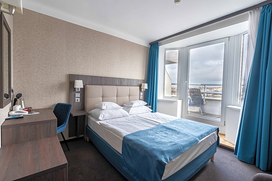 Panorama double room with terrace is 269 square feet and includes a queen-size bed 150-154 width plus desk, hairdryer, and safe.