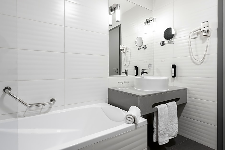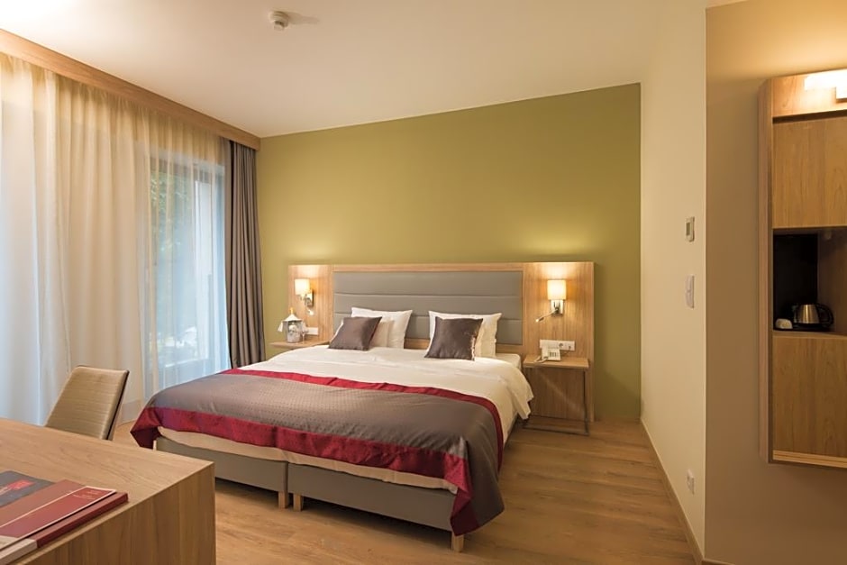 Rooms offer garden views with balconies and bathtubs, all in a soundproof, comfortable setting. Free toiletries add a touch of convenience, and garden areas invite stepping outside to enjoy a moment of fresh air without leaving the room’s tranquil vibe. The contemporary design combines comfort with a serene retreat after a day wandering Budapest’s streets.