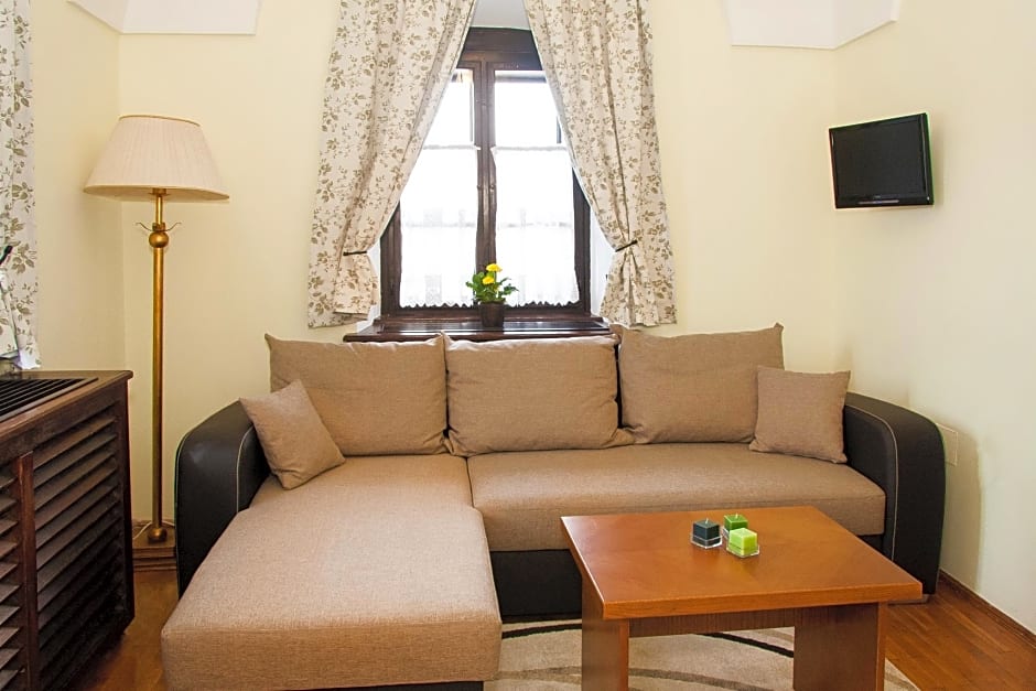 The units on the first floor has no mezzanine, and rooms are overlooking the inner yard. The room has got either a double bed or twin beds, and a sofa, which can be used as an extra bed for one adult or a maximum of 2 children under the age of 12.