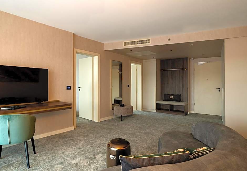 Featuring a private entrance, this air-conditioned suite consists of 1 living room, 1 separate bedroom and 1 bathroom with a bath or a shower and a bidet. The spacious suite provides soundproof walls, a safe deposit box and heating. The unit offers 2 beds.