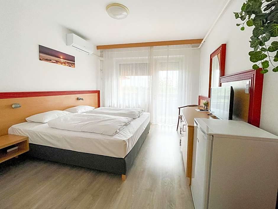 we were traveling from Netherlands to Turkey by car and had to make a night stop in Szeged urgently because we couldn’t go any longer without sleep, this hotel was the first hotel that showed up because we needed to park the car closely. it was the best choice because you can park for free right at the door of the hotel. the lady working there that checked us in was very nice and polite too. the room we had was for 3 people and it was very clean and comfortable. the hotel itself is on a great location because there was no sounds at night time, very calm and relaxing to catch up on sleep. thank you very much for the short hours we were there but we enjoyed a lot and the sleep was amazing.