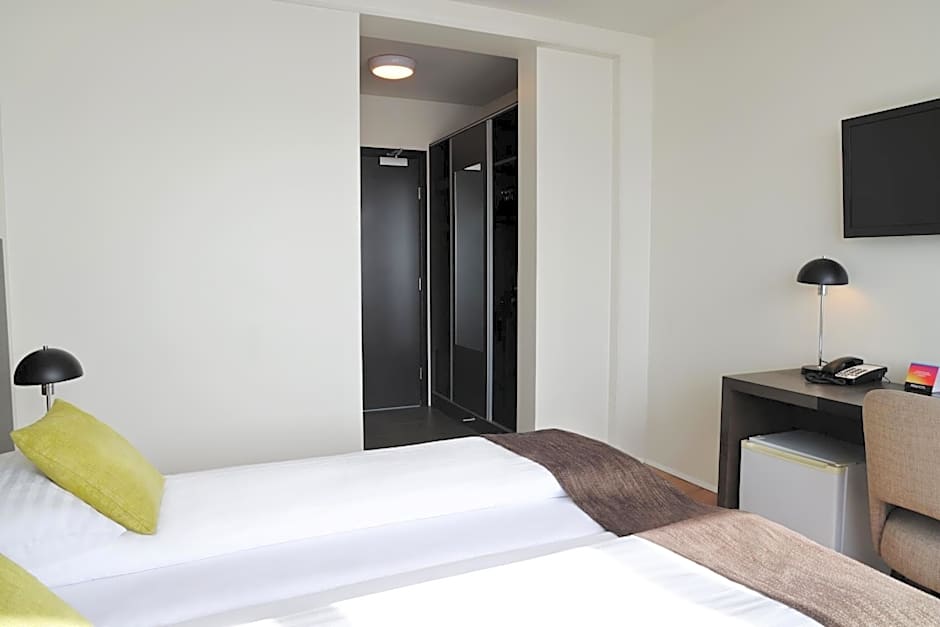 Modern room that has a flat-screen TV, blackout curtains and bathroom with a shower and hairdryer. Features either mountain or fjord views.
