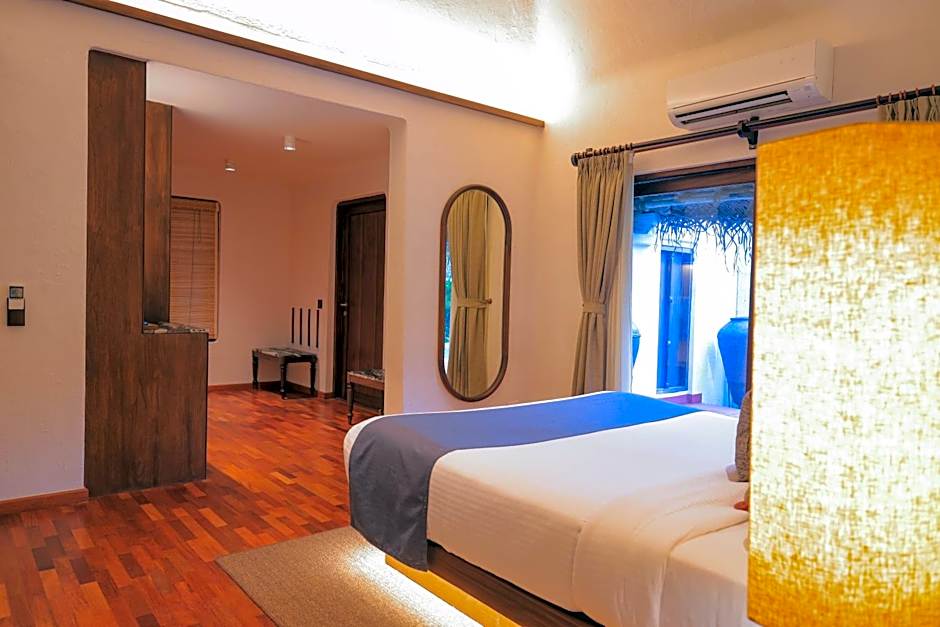 The deluxe pool villas are all large bedded. It has a separate living room, a spacious bedroom, a passage, a private sit out, a closed bathroom and one bathroom opens up to the sky. It has a much larger private pool with a garden. One of the Deluxe Pool Villas is specially designed for those with special needs; it is a wheel chair friendly room with no steps, and has railings in the bathroom etc.