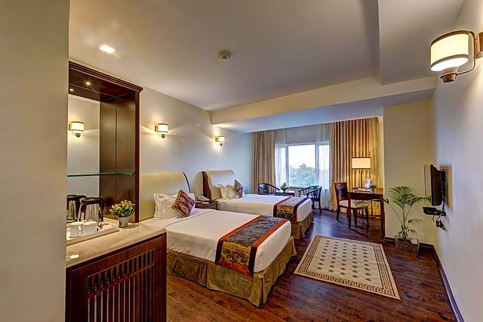 The Fern Residency Galaxy Mall offers Standard Double or Twin Rooms for single occupancy, with a room size of 301 sqft. Smoking is not allowed in these rooms. They can accommodate 2 adults and 1 child, with beds consisting of 2 Twin beds and 1 Double bed.
