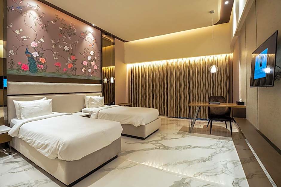Accommodations come in several stylish configurations. Deluxe (Double) at 388 sqft offers a Queen bed and accommodates 2 adults and 1 child. Deluxe (King), also 388 sqft, features a King bed and accommodates 2 adults and 1 child. Deluxe, 1 King fits up to 3 adults and 2 children with a King bed. A 388 sqft Deluxe, 2 Twin room comes with two Twin beds, while the Superior Double Room provides 484 sqft of space with a Queen bed. The Suite spans 1055 sqft and accommodates 2 adults and 1 child.