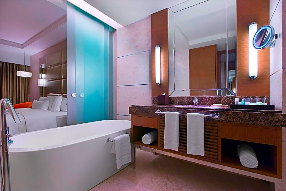 This is a club room with king bed along with attached bathroom with bathtub and shower. The room also has flat screen TV and sofa. The other amenities includes electrical kettle, mini-bar, tea and coffee sachets, writing desk and chair. Access to Club Lounge. Free Wifi is available.