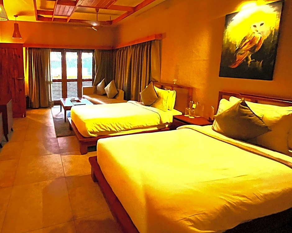 The hotel's accommodation options cater to varied preferences. The Queen Room with Balcony provides a spacious retreat, offering scenic views of the surrounding beauty. Meanwhile, the Deluxe Double Room offers comfortable and cozy lodgings for guests seeking a restful stay. Both room types are air-conditioned and provide thoughtfully appointed spaces for a comfortable and enjoyable experience during your stay.