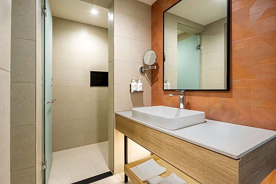 On sunny days, the rooftop outdoor pool steals the spotlight, all-season and open to guests of all ages. The pool sits above it all, with a terrace, sun deck, and a bar to complete the laid-back atmosphere—perfect for a refreshing dip followed by a relaxed drink as the city lights come alive.
