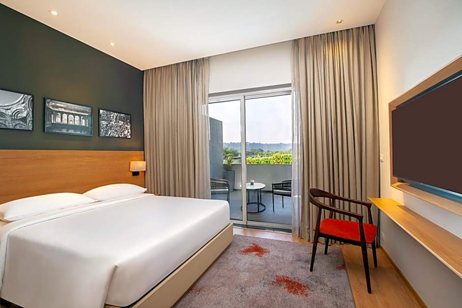 Park Inn by Radisson Gwalior offers Superior and Deluxe rooms, both being hearing accessible and non-smoking. The Deluxe room, at 344 sqft, accommodates 3 adults and 2 children with a King size bed, while the larger Superior Double room, at 388 sqft, also accommodates 3 adults and 2 children, with 1 King size bed and 2 Twin beds.