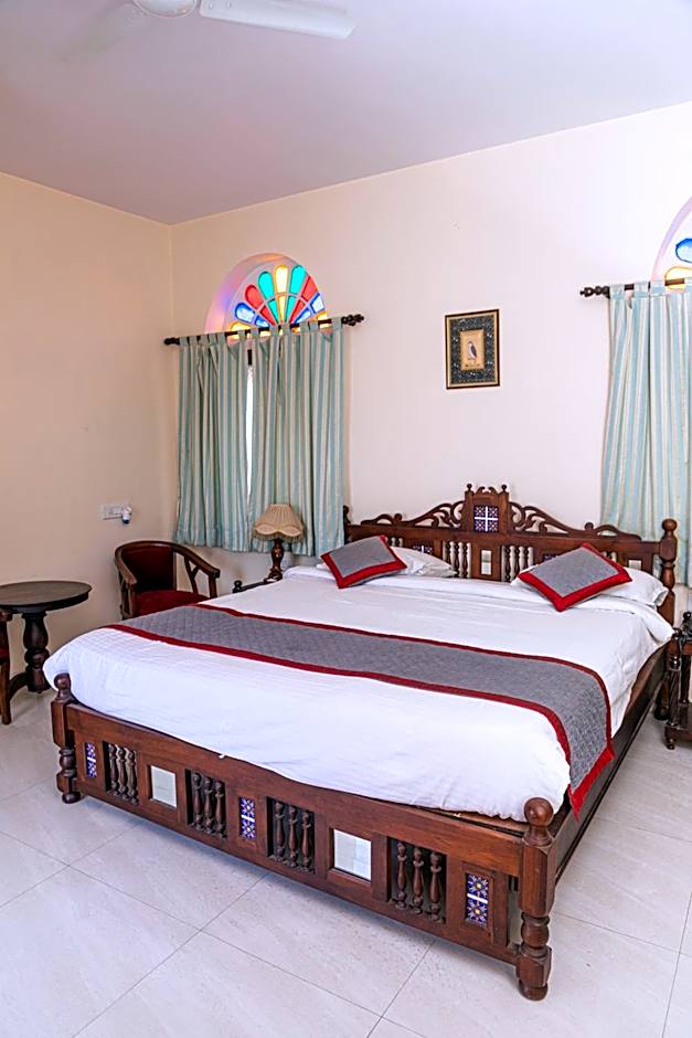 Beautiful heritage hotel with a small front lawn, an open courtyard, and a rooftop terrace with a pool. Our room was spacious, beautifully furnished, and very clean, with a cozy alcove. Very reliable warm water supply (which isn’t self-evident in India). The on-site restaurant was also excellent, and the staff were all incredibly friendly and attentive. The only small criticism would be that the Wi-Fi was unreliable, and the bed was a little too hard for our taste.