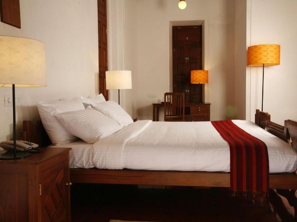 This room has high ceilings, gleaming floors and furnishings that give you a sense of luxury that is warm, intimate and rustic – inspired by the styles of the past, flawlessly crafted and made from the finest Burma teak. King-size, comfortable beds with handcrafted bed linen are provided in every suite. All the floors and the walls are inlaid with the famous handmade Aathangudy tiles. Every room has an attached bathroom, and a balcony overlooking the garden where you can spend your afternoons reading, or nights looking out into the sky.