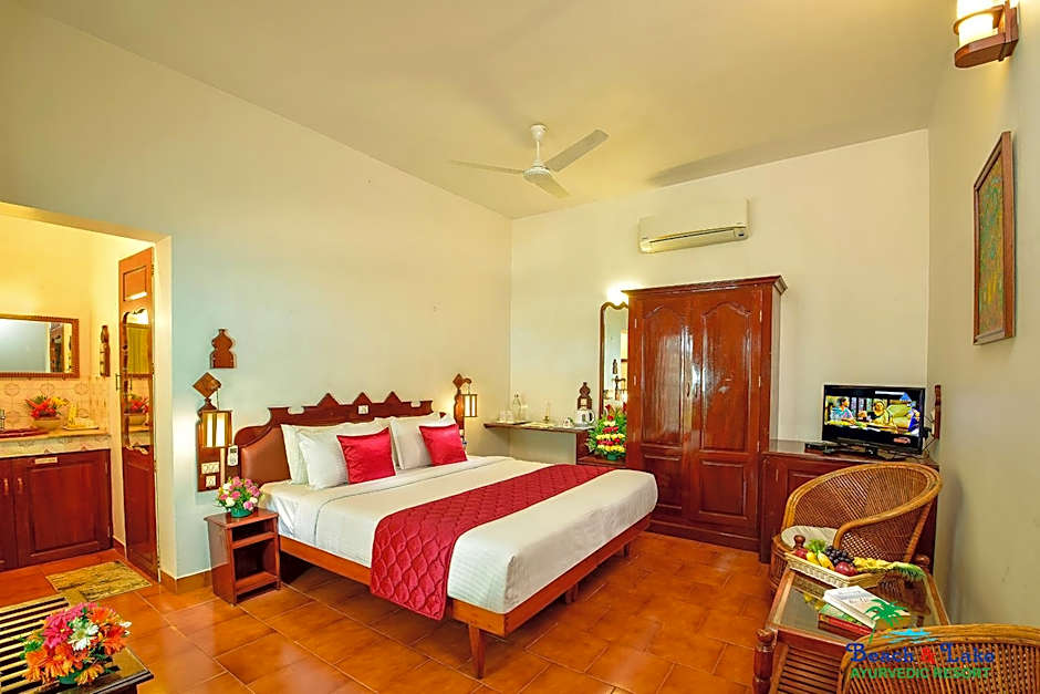 The Beach and Lake Ayurvedic Resort offers several types of rooms including Superior Deluxe (with and without bathtub) and Deluxe rooms. All rooms are air-conditioned and smoking is not allowed. The rooms are double occupancy and can accommodate up to 3 adults and 2 children. The bed size in all rooms is 2 twin beds.