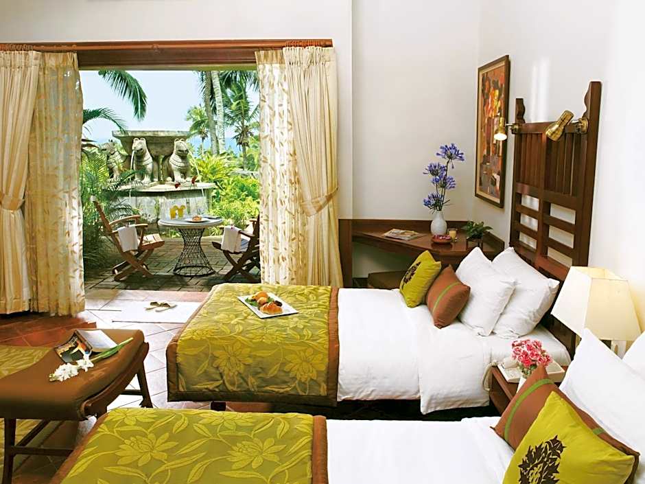 Hillside cottages feature elephant grass thatched roofs, a private balcony/courtyard and large French windows overlooking the Balinese-style landscaped gardens.
