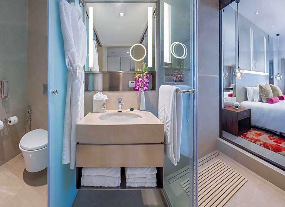 This was one Hotel where tradition met with modernity in best possible synthesis of two eras. This was one of the finest hotels i have ever stayed in the world and the atmosphere surrounding us all through our stay was nothing less than the description " pinnacle of hospitality " . The traditional Indian reception we received , as soon as we entered the premises was astounding . It was a spectacle matching with that was the ease of check in by smiling and very helpful staff at the reception . Room was fantastic with all modern amenities . The cafe, bar, Golden dragon restaurant were all fantastic but the aura inside the hotel was so spectacular that one would love to stay more days just to enjoy the Hotel itself with all it's grandeur and fanfare . Audio visual show at the swimming pool was spectacular and very informative. Breakfast spread was massive and staff wonderful and it added a special mystical feeling with live sitar being played at the lounge resonating at the minds of each and every guests .In one sentence " our stay was made memorable with wonderful staff and management alike".