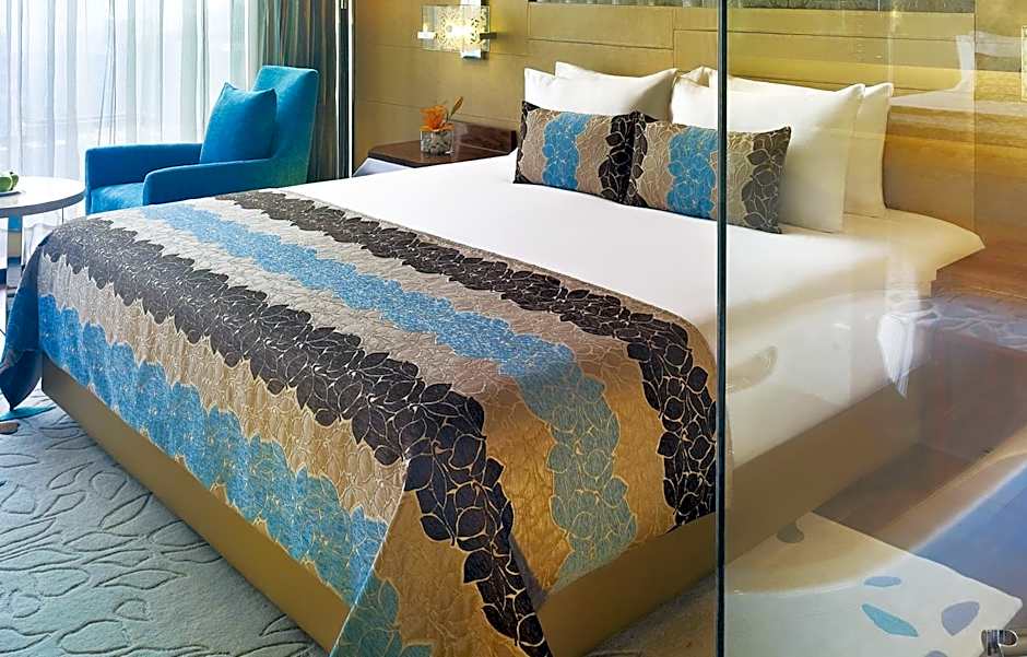 This luxurious suite with Merbau wood flooring features a separate living area, a king-sized bed and walk-in closet. They come with a 55-inch flat-screen TV. The private bathroom comes with a Seora Mirror TV, special lighting, shower and spa bath. Suites offer views of the pool or city.