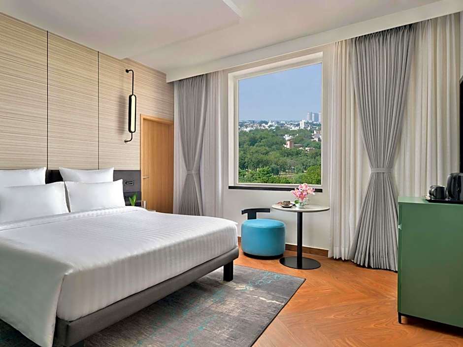The Novotel Jodhpur ITI Circle offers superior rooms with Cazri View and Fort View. These rooms are triple occupancy and have a room size of 323 sqft. Smoking is not allowed in these rooms. The superior rooms have either a king-size bed or twin beds. Additionally, the hotel offers a Junior Suite with a double bed and Cazri View, which has a room size of 366 sqft.