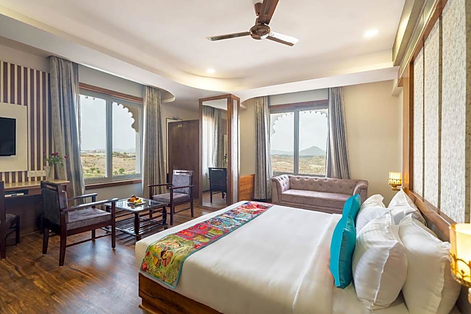 Indulge in a variety of delightful amenities designed for both fun and relaxation. Cool off in the outdoor swimming pools, including one specially for kids, or unwind at the spa when you need some pampering (extra charges apply). Savor delicious meals at the onsite restaurant, stay active at the fitness center, or simply relax on the sun deck or terrace, soaking in the beauty of Udaipur. The hotel also offers conveniences like a 24-hour front desk, room service, and shuttle service (additional charges), ensuring your needs are always met in style and comfort.
