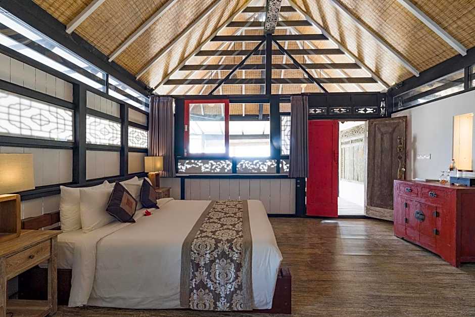 A family room which has a direct pool access from its private terrace. The cottage features premium bedding and shower in the bathroom.