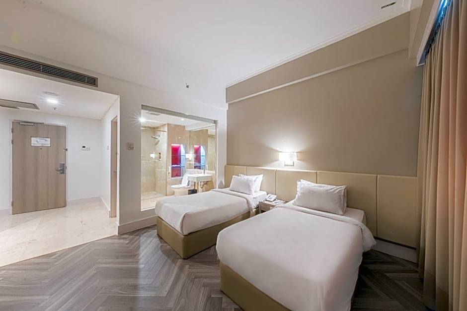 The Grand Jatra Hotel Balikpapan offers a variety of room types including suites and twin/double rooms. None of the rooms allow smoking. Bed sizes range from twin beds to king and queen size beds. The rooms can accommodate either 2 adults or 2 adults and 2 children. Room sizes range from 344 sqft to 861 sqft.