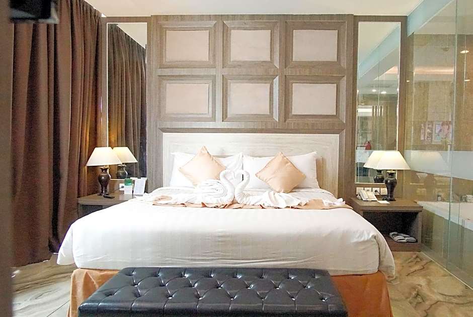 Accommodations span a range from Deluxe and Superior rooms to the Presidential Suite. The Presidential Suite covers 872 square feet and includes a Queen-size bed plus a sofa bed, accommodating up to eight adults and five children. For views, options include Sea View and City View rooms, with configurations ranging from Queen or King beds to twin arrangements.