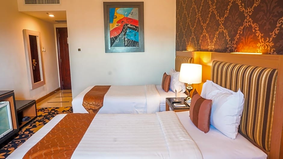 The Grand Rocky Hotel Bukittinggi offers various types of rooms, including Deluxe Twin Rooms and Deluxe King Rooms. All rooms have a size of 344 sqft and do not allow smoking. The Deluxe Twin Rooms have two twin beds and accommodate 2 adults and 2 children, while the Deluxe King Rooms have a queen size bed and also accommodate 2 adults and 2 children.