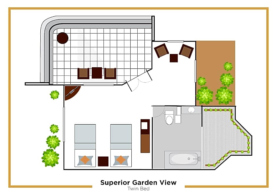 Superior Garden View is 323 square feet and includes a king-size bed 150-183 width.