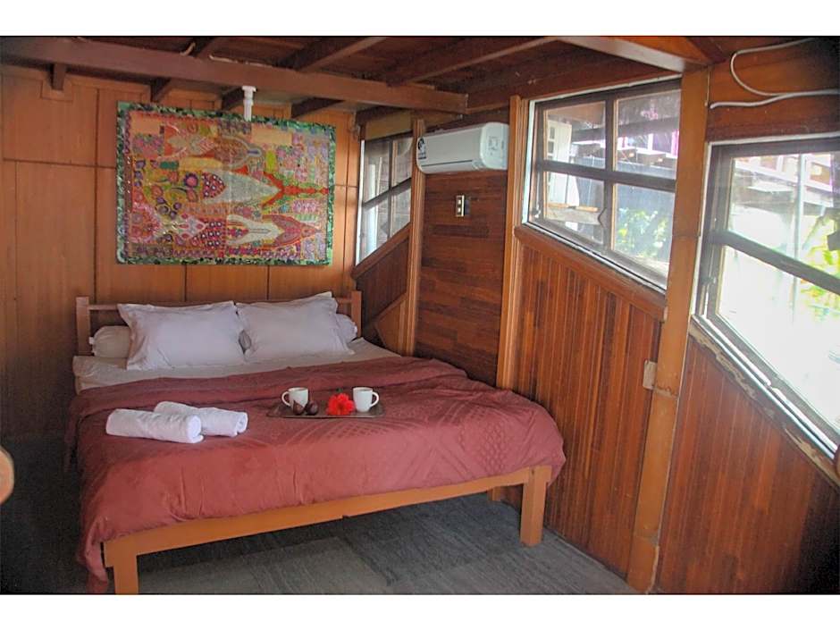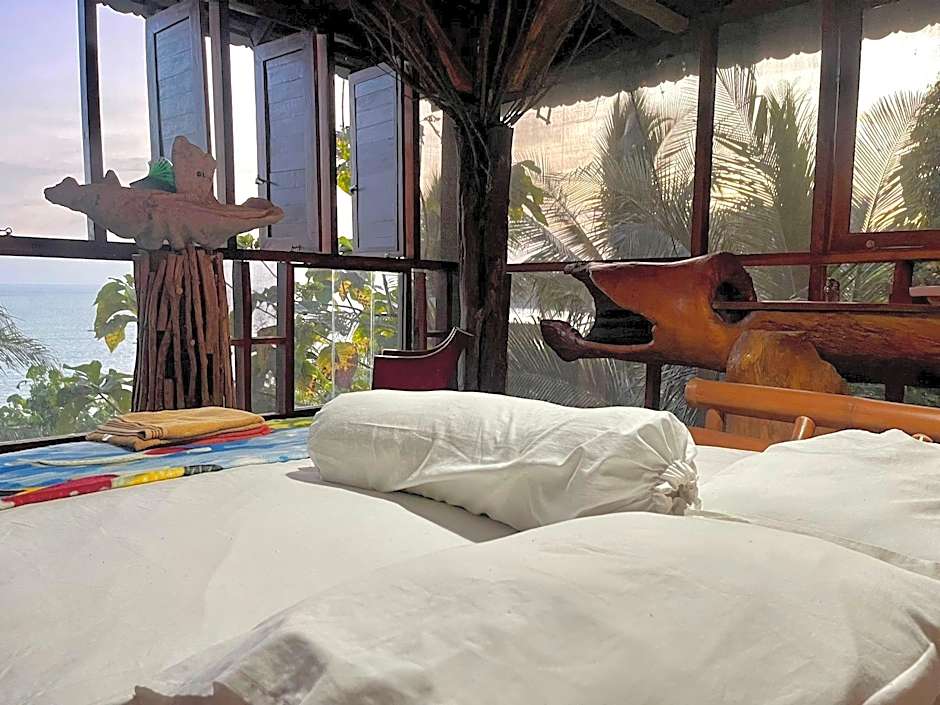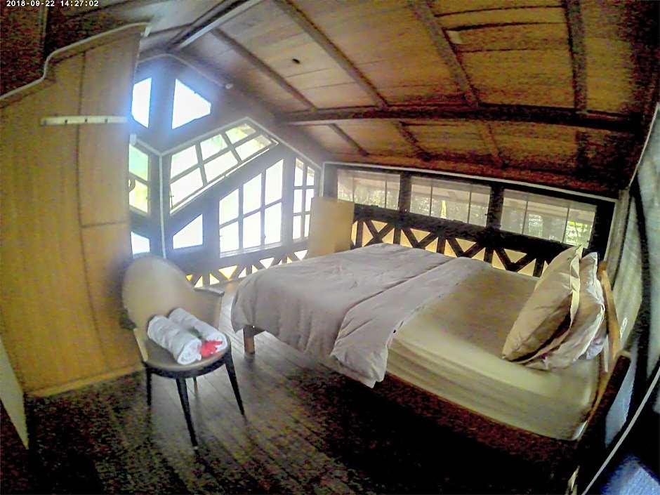 A bit rundown tree house-like cabin plus bathroom and veranda, in the middle of the woods. Clearly the superb facility none other accommodations can offer is the bird's eye view from the veranda, bedroom, even from the toilet window! Absolutely relaxing sitting at the breezy spacious veranda overlooking the beachshore, hearing the sound of blown leaves, crickets, ducks, chickens, all the nature you'd miss getting if you live in city. Walking down to the beach is an easy job. Walking back up takes a strong stamina due to steep ca 200 meter distance. Fresh and shady during the day, very dark during the night. Do not expect fancy clean atmosphere as in photos. However, hot water/shower works, AC works, comfy bed, extremely simple fried rice for breakfast. Value for money. Helpful assistant. Recommended for back to nature-kind of staycation